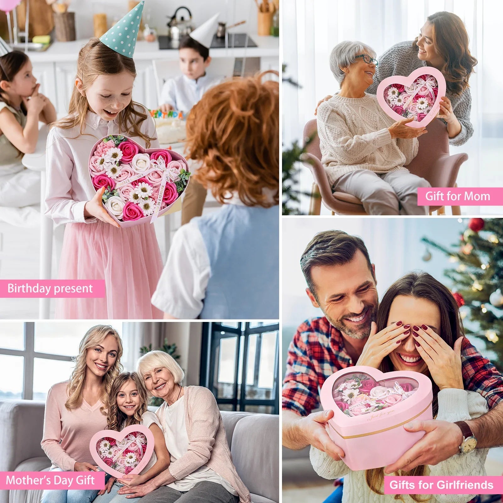 This Mother's Gift Rose Soap Flowers is a heart-shaped, pink bouquet of lasting soap roses designed for moms, wives, girlfriends, and friends. It combines the charm of fresh flowers with maintenance-free longevity, making it a thoughtful, enduring gift.